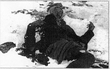 VOOR ALTIJD BEVROREN American Horse was diep geraakt door de slachting in Pine Ridge, want hij had Miniconjou Lakota-opperhoofd Big Foot bewogen om terug te keren naar wat een slagveld bleek te zijn. Op 29 december 1890 werd Big Foot, reeds ernstig ziek door longontsteking, gedood door een soldaat. Deze foto van zijn verwrongen bevroren lichaam is wellicht het bekendste beeld van het bloedbad bij Wounded Knee. |