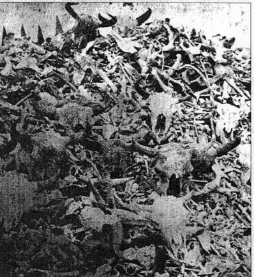 HET EINDE VAN EEN LEVENSWIJZE De hele 19de eeuw hoopten zich schedels en botten op waar blanken voor hun plezier en hun gewin bizons afslachtten. Ook inheemse volkeren stierven in grote aantallen door ziekten, honger, oorlogen en bloedbaden. Het einde van de bizon was ook het einde van een levenswijze voor de prairie-indianen. |